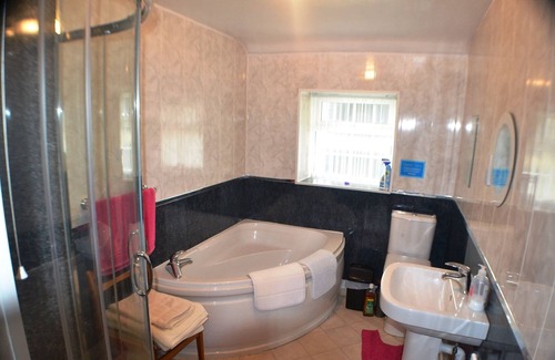 Bathroom with Corner bath, shower cubicle, toilet and washbasin.