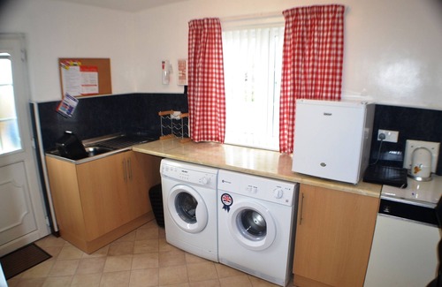 Kitchen diner with electric cooker, fridge, microwave, toaster, cutlery and crockery