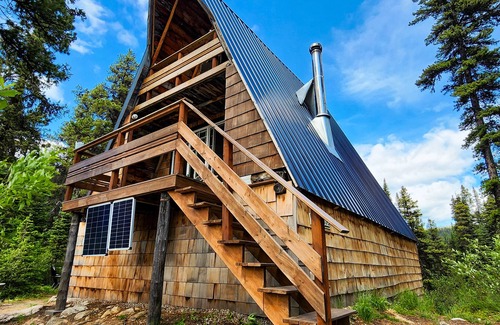 Welcome to Cooks and Puppies Hideaway! Our rustic escape on the edge of wilderness is located 9kms south of world famous Jade City, BC, Canada. Enjoy our off grid waterfront chalet with stunning views. Our chalet is fully equipped with a full service kitchen including propane range, fridge and freezer. A hot indoor shower is provided with a short walk to our loo with the best view! Upstairs you will find a comfy king bed accessed by ladder. Delicious homemade dinner and breakfast are included in your stay. Easy highway access and parking. Please note there is a short 75m trail access to the chalet.