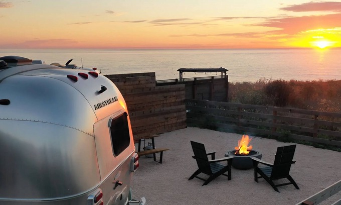 Immerse yourself in the tranquil beauty of the Pacific with our Ocean View Airstream retreat, where stunning sunsets and the soothing sounds of the waves create a profoundly relaxing atmosphere. This meticulously designed Airstream features a pristine, white interior that radiates an airy, serene vibe, making every moment inside as delightful as the outdoors. Outside, the spacious patio sets the stage for unforgettable evenings around the fire pit, with comfortable seating that invites you to linger under the stars. Prepare culinary delights on the pizza oven or enjoy a classic barbecue using our grill, all while overlooking the magnificent coastal vistas. Whether it's a romantic getaway or a solo journey to find peace, this Airstream offers a magical blend of nature's beauty and creature comfort, ensuring every stay is nothing short of spectacular.