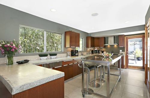 This stylish peaceful house is nestled on a quiet little street right off Mulholland Drive.As you enter light airy living room complete with mid-century fireplace, you'll see the spectacular view to the left.To the right the open kitchen with a chef's oven flows to the salt water pool and cabana area complete with outdoor fireplace and BBQ grill— evocative of a boutique hotel. Contemporary yet comfy.