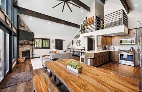 Stunning vaulted ceilings and modern finshes give this waterfront home an elegant but still rustic feel. Featuring a great open space for entertaining, the main living area has an exquisite focal point of floor to ceilings windows with lake views. Comfortable leather seating is nestled in a corner and across the room, the dining area seats four at the wooden table. This spacious level also houses the kitchen complete with a breakfast bar that seats three.