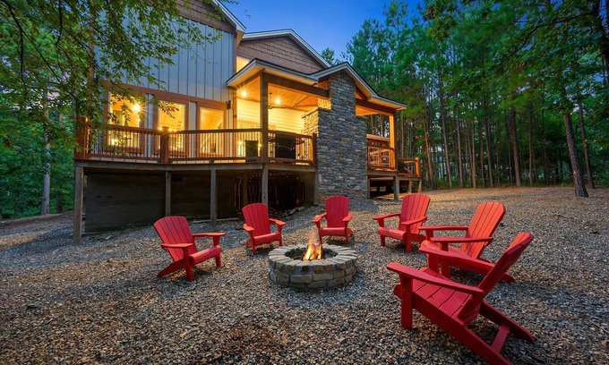 Downstairs, you’ll find a firepit with Adirondack chairs, string lights, and a swing… perfect for roasting s’mores or stargazing. A private hot tub offers a luxurious place to unwind after a day of adventure.