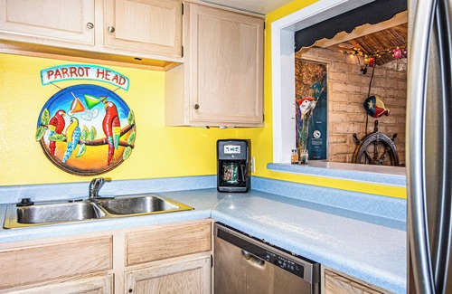 Yes, Coral Cay #202 features a fully equipped kitchen. It includes a stove, oven, microwave, full-sized refrigerator, and dishwasher. The kitchen is also stocked with essential cookware and dining ware, such as pots, pans, plates, utensils, and more—everything you need for preparing and enjoying meals during your stay.