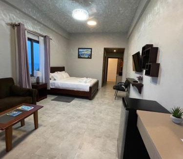 BathroomPrivate bathroom, Shower, Shampoo, Toilet paper, Hairdryer, Free toiletries, Guest bathroom, Towels, Body soap, ToiletGeneralTrash cans, Key card access, Air conditioning, Key access, Tile/Marble floor, Fan, SafeMedia & TechnologyFlat-screen TV, Telephone, TVOutdoorsBalconyKitchenRefrigerator, Electric kettle, MicrowaveLiving AreaDesk, SofaViewSea viewAccessibilityEntire unit wheelchair accessible, Upper floors accessible by elevator, Accessible by elevatorRoom AmenitiesNon-feather pillow, Sofa bedPool and SpaRooftop poolFood & DrinkBottle of water |