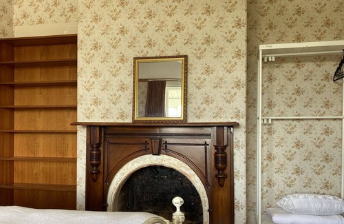 The home has high ceilings, polished floorboards, open fireplaces and antique lighting set back hidden from the road in a large garden.