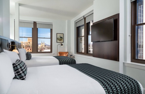 Equipped with everything needed for the perfect stay, our Classic Double Queen rooms feature two luxurious Queen size beds. These corner rooms provide breathtaking views of the city and surrounding mountains while offering comfortable seating, personal work space, and bright, spacious bathrooms that feature a walk-in shower with custom tilework.