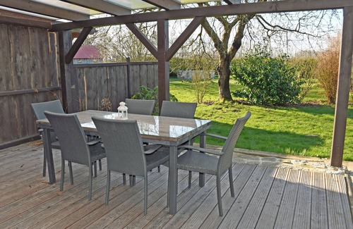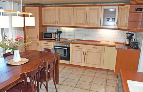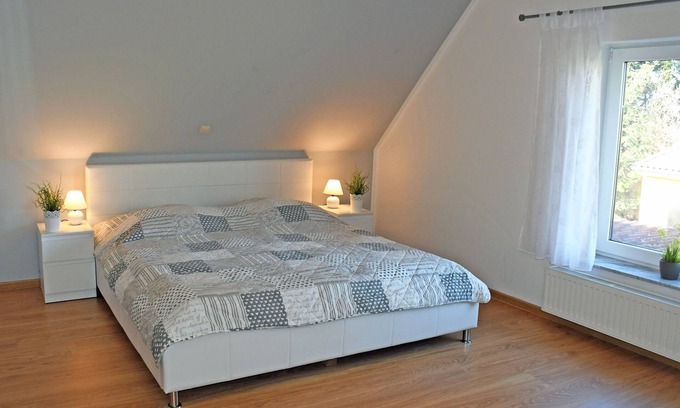 Our spacious apartment Kornblume offers on about 100 square meters, a total of 5 adults and 1 child up to 7 years, enough space for a relaxing holiday. On the ground floor is a large entrance area as well as a separate kitchen. The kitchen has a stove, oven, microwave, extractor, dishwasher and a dining table with seating and all accessories. In the upper section you will find a corridor with reading corner. The combined living room / bedroom is equipped with a comfortable double bed, bedside cabinets, reading lamps, a couch, a couttop table and a TV - flat - unit with DVD. There is also a children's bed bor child up to 7 years (70 x 140 cm). The second bedroom also has a double bed, nightstands, reading lamps and a wardrobe. In an additional bedroom can be provided an extra bed for a 5 guest. The bathroom is equipped with shower, vanity and toilet and has natural light. When you arrive, the beds are self-contained with bed linen (for bookings up to 4 nights for a surcharge of 5 euros per guest), towels please bring your own. This apartment has a large terrace with garden furniture and barbecue facilities. Here you can relax your holiday with a glass of wine.
