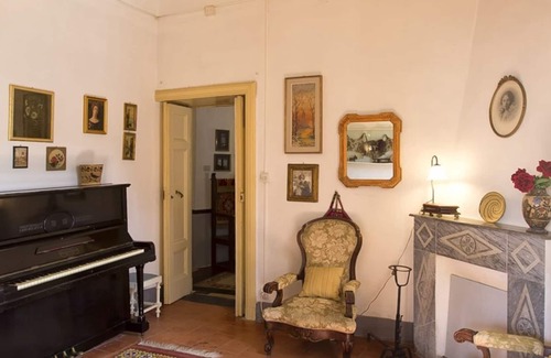 The sleeping area consists of a large bedroom suite full of antique furniture with a cozy anteroom living room with a comfortable sofa bed, a piano, a fireplace and a narrow balcony.