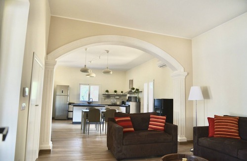 The Villa has a very spacious living and dining room, a well-equipped kitchen, with all the necessary kitchen appliances, three bedrooms (with double beds) and two large bathrooms (one with a washing machine). All rooms are air conditioned. A large shaded courtyard is connected to the dining room overlooking a cozy garden with orange and lemon trees.