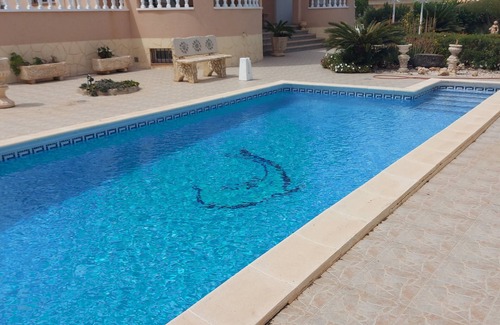 This large villa with private pool is set on a small exclusive hillside development just outside San Miguel de Salinas village with its selection of restaurants. It is surrounded by Almond and Citrus Groves and has award winning golf clubs nearby. It is a15 mins drive from Campoamor and Mil Palmeros beaches, 30 mins to Mar Menor, the famous 42km promenades lagoon with its beautiful sand and famous mud baths. La Zenia Boulevard is 15 mins drive and has a wide selection of shops. Campoamor, Las Ramblas, La Finca and Mar Menor golf courses nearby. Murcia Airport is 45 mins by car and Alicante Airport 55 mins away.