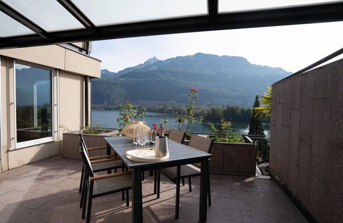The Mariahalden vacation rental in Weesen offers a spacious and comfortable living experience with 160 m2 (1,722 sq. ft.) of space, accommodating up to five guests. It features two bedrooms, 2.5 bathrooms, a self-contained kitchen, a spacious living area, and an inviting balcony with a unique view of the Walensee and the mountains. The property provides amenities such as Internet Wifi and Parking.