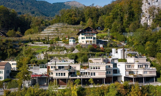 The Mariahalden vacation rental is located in an apartment building on a slope, accessible by one flight of stairs or an elevator. It is just a few minutes' walk away from the charming town of Weesen, which boasts historical buildings, shops, a Spar supermarket, a post office, various restaurants, and the Weesen marina.