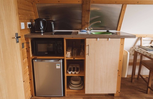 Enjoy a comfy, heated wooden cabin, complete with en suite shower & toilet, heated towel rail, and hairdryer. The cabin features a kitchenette with two hot plates, a fridge, kettle, toaster, and microwave, along with all necessary cooking utensils, pans, crockery, and cutlery. It also includes WiFi, a TV and a dining table. Outside, a private deck includes a picnic table, fire pit, and Wood-Fired Hot Tub.