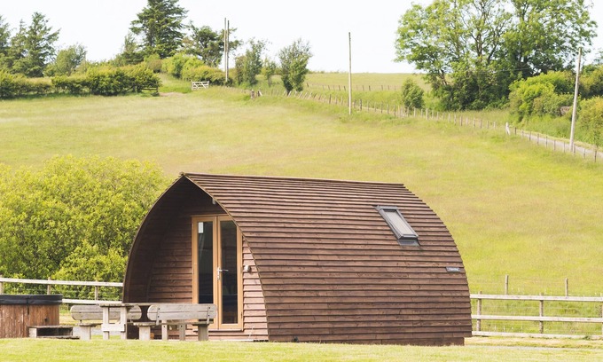 Seven en-suite glamping cabins line the edge of the pretty farm. Each one has its own outdoor private dining area with views across the countryside to the majestic mountains. Inside, the cabins are insulated and fully fitted for everything you need for a relaxing stay in the mid-Wales countryside.