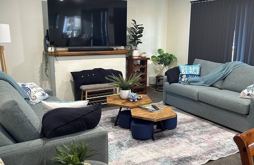 The open-plan lounge/dining area offers 2 x 3-seater comfortable couches, 75" smart TV with sound bar, 8-seater dining room table, bar fridge and Bluetooth speaker with charging station.