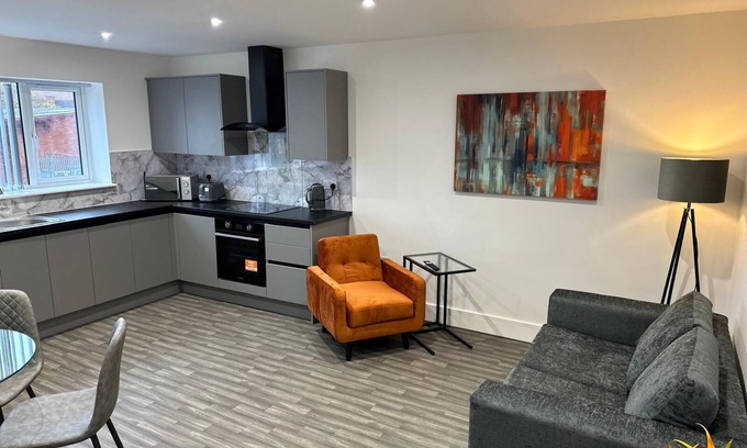Discover this inviting 2-bedroom apartment ideally located in Long Eaton, perfectly positioned between Nottingham and Derby for seamless travel to both cities by road and rail. This charming flat offers an open plan kitchen diner, a welcoming hallway, and a comfortable living space, complete with a 2-seater sofa bed, armchair, and wall-mounted smart TV.