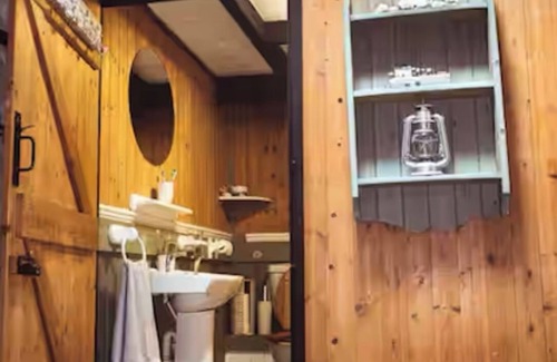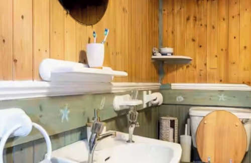 The bathroom is compact and practical, with pine cladding, a bath with a shower over, a sink, and a WC.