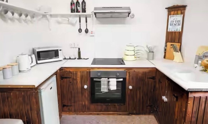 The kitchen is simple and compact, with a handmade wooden design that provides everything you need for your stay, including a microwave, toaster, kettle, and essential cookware.