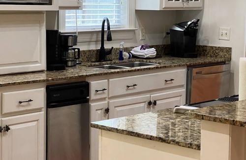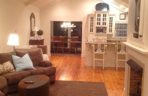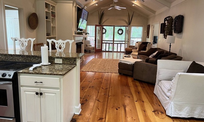 Once here, you won't want to leave. Upon entering the cottage you have a great room with a fireplace and a great view in both directions. The Kitchen has a Jennaire range, a side by side stainless refrigerator, granite, and a large pantry.. The sun porch has a table that seats 10 plus a daybed. To the left of the great room is the master suite with king bed, tv, walk-in closet, large bath with shower and large jacuzzi tub with view of the woods. To the right of the great room is a full bath and 2 bedrooms. One has a king bed and the other a queen. and one has cable tv. I just added a 65” Smart TV. . House has WiFi . There is a walking trail through the 75 acres with a fish pond. Sit around the wooden fire pit at night.