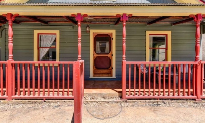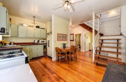 The cottage has two bedrooms downstairs and an open upstairs loft. The front bedroom has a double bed and a twin. The back bedroom has one queen bed. The loft has a double bed and two twins. There is one full bath in the main house with a clawfoot tub and shower option. The downstairs basement area was historically a brewery, and the rustic walls and marble floors reflect that history. The basement has a dining area, a pool table, a full kitchen and bath (so technically it’s a “2 bathroom house”, but the basement is accessed thru the outside), and opens to the backyard via a large barn-type door. The backyard borders a creek and is quite spacious. There is ample dining space and games available.