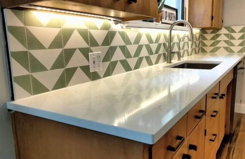 Kitchen newly remodeled with new countertops, sink, backsplash, and a dishwasher!