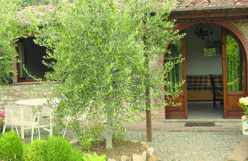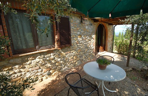 This sweet detached cottage, whose front door facing the field allows for extra privacy, has a furnished garden patio set in the shade of an olive tree. The arched doorway leads into a large kitchen/dining-room with sofa and corner fireplace, while a short corridor leading off the living area accesses both a double bedroom and a shower room. The views over the Chianti hills are stunning and the walk to the pool set amongst olive trees and grapevines is always enticing. A perfect accommodation for a couple seeking authentic Tuscany.