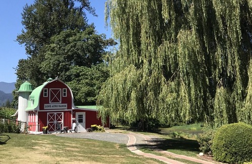 We have converted our carriage house, which looks like a traditional red barn, into a comfortable vacation rental home. It is on the north side of Chilliwack in farm country, just minutes away from the Fraser River and downtown Chilliwack. The house has a large master bedroom with a king-sized bed and a twin-sized day bed with a twin trundle bed underneath. It also has a den with a fold out queen-sized bed. The beds are all quite new, with cotton sheets and hypoallergenic duvets. The bedding is all washed according to current cleanliness standards, and high-touch surfaces are disinfected between guests. There is in-suite laundry, and one bathroom with shower. The vacation rental is all on the ground level, and the upstairs of the barn is vacant.