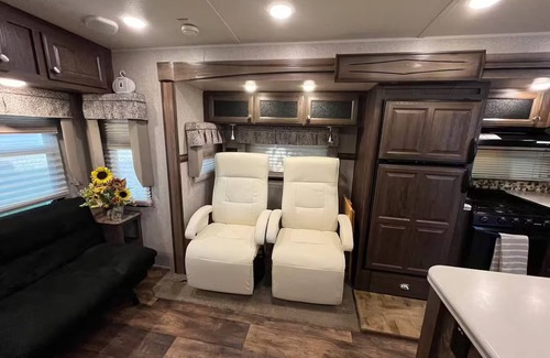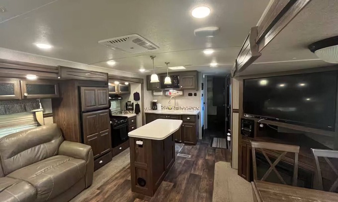 Escape to this cozy 1-bedroom camper with a queen bed, full shower, indoor fireplace, and island kitchen. Unwind in the hot tub, dip in the cold plunge pond with a waterfall, or relax by the gas fire pit on the sandy mini beach.