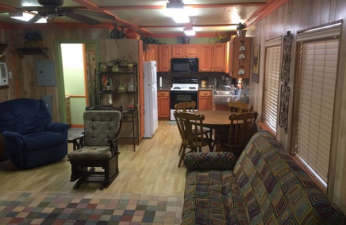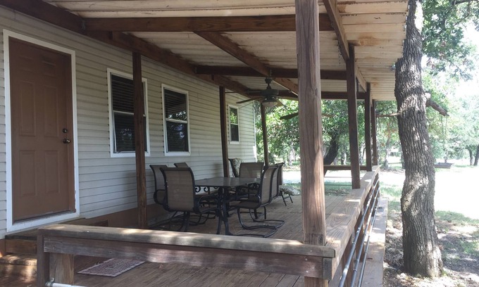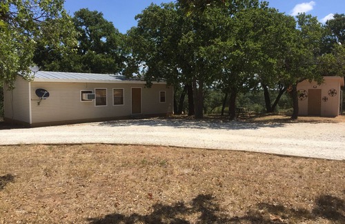 Eight acre wooded country setting with two bedroom cabin. One queen bed in each bedroom. Full kitchen with all necessary essentials for cooking, bathroom with tub/shower and living room, with 2 double bed futons in living room. Heating with electric floor heaters keeps the cabin comfortable. Air conditioning is provided by three through the wall window air conditioners. Covered wooden deck has outdoor table with six chairs and one lounge recliner chair. Located approximately sixteen miles from Fredericksburg, Texas. Three miles from the scenic Willow City Loop and twenty four miles to Enchanted Rock. Located on popular bicycle and motorcycle route. Owner residence is on property. Abundant deer and other wildlife seen daily.