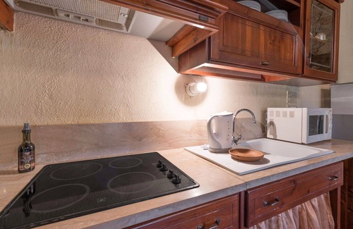Cosy living room with 19th-century furniture. Ample corner kitchen with electric hobs. Three double rooms, three bathrooms with shower. The largest bedroom, known as the bedroom "del Vescovo" or "of the Bishop" because of its imposing 19th-century wooden bed, also has a single sofa bed and a small wrought-iron child's bed.