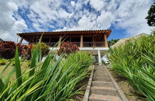 la finca es muy agradable y cuenta con todo el segundo piso como salón de reuniones con hamacas, cocina grande y mesa de comedor familiar.