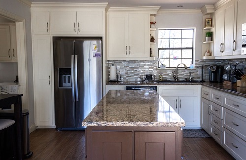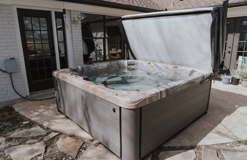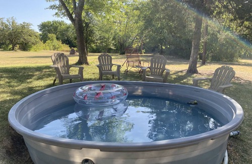This quaint, recently renovated farmhouse sits at the end of Farm Lane. The two guest bedrooms with queen beds have French doors that open to a covered porch, where you can sit and enjoy a cup of coffee overlooking the pond. The Master bedroom has a king bed and French doors, but opens to the back patio where the hot tub sits. Your kids will enjoy climbing the ship ladder into the loft that has five built-in beds and sleeps 7 (2 full-size beds, 3 twin beds). The kids will also enjoy the recently added "stock-tank pool." It is a cattle tank that we converted to a small pool to help our guests cool off in the summer months. The fully furnished kitchen and 2 refrigerators make it easy to prepare meals, and the extended kitchen table and 2 additional bars make it possible to feed 13+ guests in the kitchen. While you are here, enjoy a quiet walk down Farm Lane, or around the 50-acre property (you might even see a few of our neighbors’ peacocks). This house is perfect for a quiet time away with your loved one, or a great place if you have multiple families or a large group! For more information about us, the house, or the area, check us out on Facebook at Legacy Farms and Getaways.