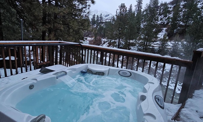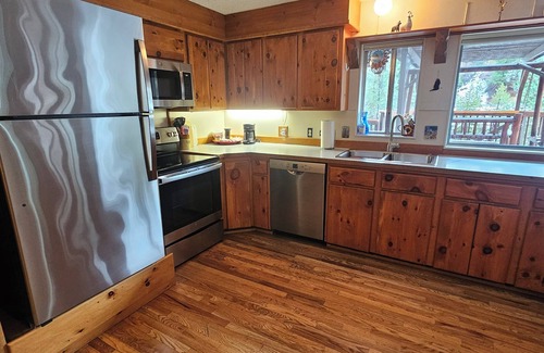 This rustic cabin is a single story home with an expansive redwood deck and hot tub, overlooking Mores Creek. The master bedroom offers a custom made king log bed. The well stocked kitchen offers ample counter space with a large picture window with a clear view of the picturesque creek. The dining area boast a large rustic style table, perfect for playing boards games on after dinner. The second bathroom surprises guests with its' spacious shower and dual shower heads. When the snow starts to fall, guests love to cozy up next to the warm, wood burning stove and enjoy the unmatched beauty of winter in the mountains.