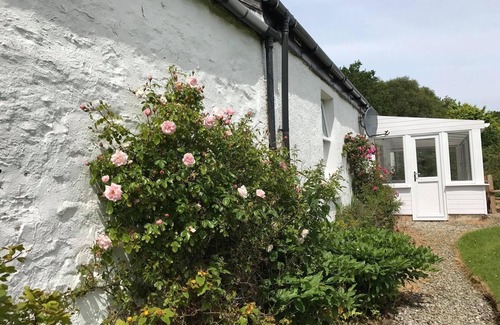 It features a kitchen with breakfast bar, open plan to the living room with open fire, a double bedroom (ensuite shower room), twin room, conservatory, utility room and bathroom. There is an outbuilding, ideal for storing bikes etc. The mature garden is a good size, and enclosed, and there is a large field area beside the house, ideal for ball games with your four-legged friend!