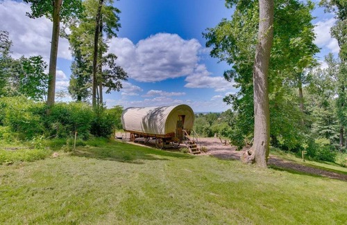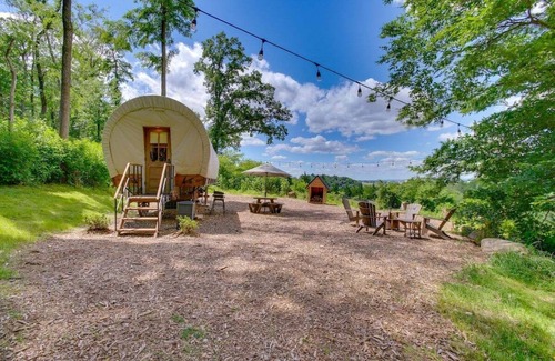 Welcome to our cozy covered wagon, nestled in the peaceful woods with beautiful views. This unique camping experience offers a one of a kind getaway for nature lovers seeking tranquility and relaxation. Step outside to enjoy the fresh air, go for a hike, or simply unwind by the camp fire. Escape the hustle of everyday life and immerse yourself in the beauty of nature at our covered wagon on the hill top.