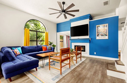 The high ceilings and bright decor of the living room welcome you to your next vacation. Curl up on the chic oversized sofa and watch a family favorite film on the wall-mounted 65-inch Smart TV while a fire effect crackles in the modern fireplace. This space is decorated in bright colors and adorned with carefully selected decor pieces in honor of Fiesta, San Antonio’s annual Tex-Mex celebration.