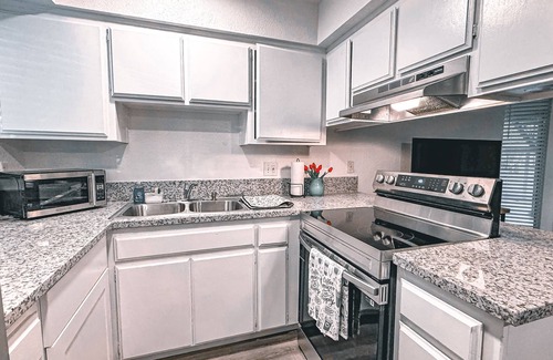 Welcome to E&M Rental Enterprises LLC, Mid-term rentals! Here is our beautiful 1 bedroom 1 bath luxury unit! fully furnished and move in ready for your midterm or long-term stay!. Bedroom is private and has a queen-sized memory foam mattress for an amazing comfortable stay! This Sofa also turns into another sleeping bed! This is a GATED community apartment complex. This unit is near all major hospitals. All amenities included such as wifi/internet, coffee maker, kitchen/cooking essentials, blacked out curtains for our workers with night shifts. FREE ASSIGNED PARKING, Community pool and amazing plaes to eat near by!