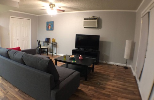 This house has an open floor plan with the kitchen, dining, living room and office all in one area. The kitchen is fully functional with dishes, pots and pans, eating and cooking utensils, along with common spices and oil to make it easier to prepare home-cooked meals. Your long stays will be pleasurable with all the comforts of home. The bedroom has a full size bed and the sofa is a full size sleeper.
