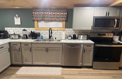 The heart of the cabin is the inviting living room, where soft lighting and warm wood tones create a cozy ambiance. An electric fireplace adds a comforting glow, perfect for curling up with a good book, watching your favorite movie, or simply relaxing after a day of exploring. Adjacent to the living room, the fully equipped kitchen makes meal preparation a breeze, whether you're cooking up a hearty breakfast before a day of adventure or enjoying a home-cooked dinner after sunset. When it’s time to rest, the cabin’s two bedrooms offer a cozy escape. The primary bedroom features an electric fireplace while the second bedroom is designed with fun in mind, featuring a classic multicade arcade system that will keep guests of all ages entertained. Free WiFi is also available throughout the property.