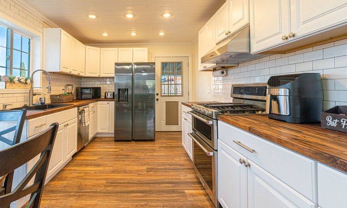 Located in a quiet neighborhood in Golden Hills just outside of town. This lovely property includes 1 Queen and 2 Full sized beds. 4k TVs mounted in all rooms with Hulu, Disney, HBO, Showtime, ESPN & Netflix. High Speed 400 MB Wi-Fi Internet provided. Board games for adults and kids provided. Dart board, arcade games, and air hockey set up in the garage. Desk setup with monitor, mouse, and keyboard provided. Kitchen stocked with dining, cooking, and baking essentials, as well as a coffee bar. Large, covered patio with seating for 8 in the back yard complete with a charcoal BBQ. Finished garage with washer & dryer.