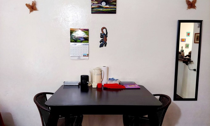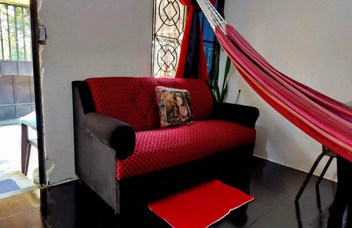 This area is quiet only at night, but is safe all the time.police station 2 blocks a restauran w a pool within 2 mts walk pharmacy 1 block. Other businesses like fruit stands, beauty salons,pupuserias 1 block away. This is a happy espiritual but not religios home.