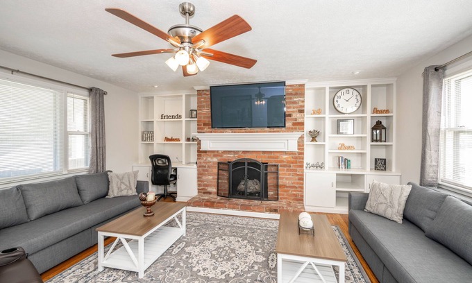 Welcome to Kings Cozy Corner for your next stay in the Cincinnati area! Originally built for employees of the innovative King Powder Company and Peters Cartridge Company, this newly renovated home was built in 1921 and is located about 25 miles NE of downtown Cincinnati, just off I-71, in the historic Kings Mills area of Warren County, Ohio, just up the hill from the scenic Little Miami River and Bike Trail. Today, this home boasts stair-free access to the main level, 3 bedrooms, with a 1st floor master and 2 full baths (1 on each floor) and sleeping accommodations for up to 21 of your closest friends and family (1 King, 1 Queen, 1 futon, 2 twin triple bunks, 1 full triple bunk & 2 Queen sleeper sofas).