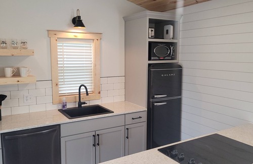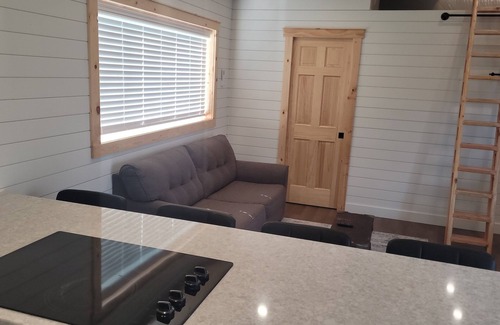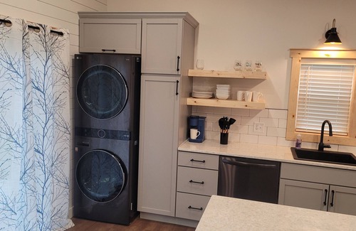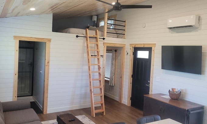 This new and modern cabin with a retro feel features 1 bedroom with a cozy queen bed and TV, a lovely bathroom and shower complete with supplemental heat and a heated mirror, a small loft with a full bed (accessed by a custom ladder), and a combined living room/ kitchen with a sofa sleeper and 55 inch TV. With amenities like an iron, AC, hair dryer, WiFi, microwave, refrigerator, range top, dishwasher, washer/dryer, and all the kitchen amenities, guests will have everything they need for a wonderful stay. A firepit with Adirondack chairs and firewood make a great gathering spot while grilling out on the provided grill.