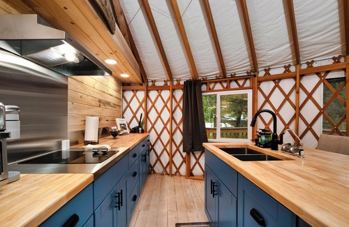 The 30’ yurt came from Pacific Yurts in Cottage Grove, Oregon. The yurt was erected in 2022 and in 2023 we added all the rooms and beautiful woodwork inside. It is on a Kiln Dried Tongue and Groove decking. Yurts are designed to withstand cold winters and this one is no exception.