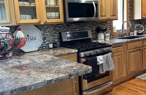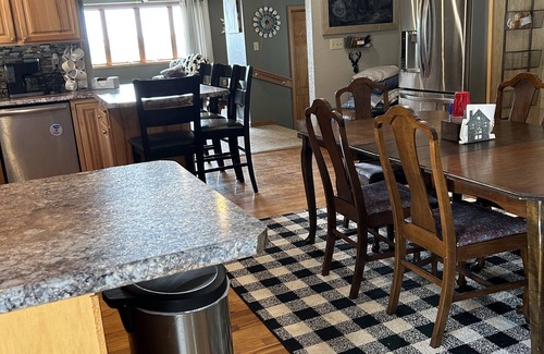 Prepare to relax in this lovely farmhouse on a 5 acre acreage. On the main floor is large living room area that opens up from a very usable kitchen that has full cooking capabilities. Downstairs is another area to hang out with another large room that has a sitting area, TV, and card table. And if you need privacy from the rest of the group, we have 5 rooms on 3 separate floors to recover after a day’s worth of relaxation or any of number of outside activities. The house sets on a 5 acres of open field, trees, and a beautiful patio that overlooks it all with very private Jacuzzi. We set this house up to take care of our very own family and would love for you to experience this farmland oasis.