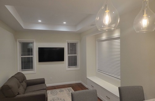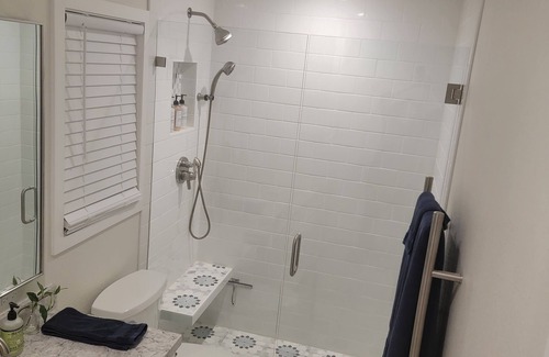 The space itself is pristine, with a full fridge and full washer dryer, heated towel rack, a window seat with storage in the bedroom and living room, 50" tv in the living room and 43" in the bedroom, wireless internet, AC and heat, two showerheads in the shower, and the warm feeling of comfort and welcome.