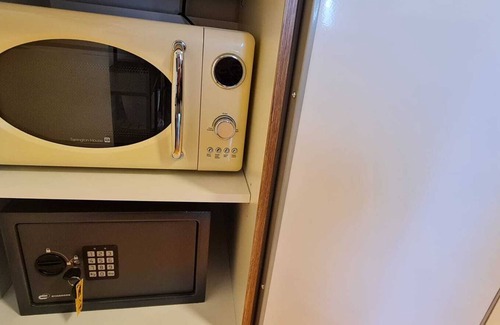 The kitchen has a fridge, a hob, an oven, a kettle, a freezer and a microwave.