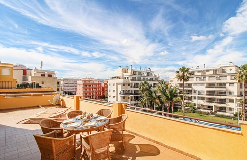 This spacious, bright vacation apartment with communal pool is located in Denia on the Costa Blanca. The living spaces are distributed 3 bedrooms and 2 bathrooms, one of them en suite. There is a large living room and from the kitchen direct access to the terrace. The spacious terrace is divided into three different areas: two areas on the covered terrace, one of which is a rest area, and a sunny area where you can enjoy pleasant meals and watch beautiful sunsets.