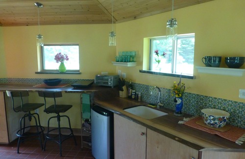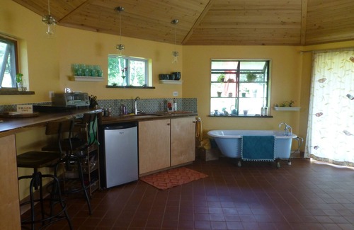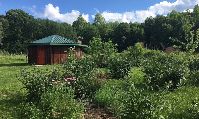 Relax and enjoy life in a beautifully simple tiny house! Clad in cedar and bathed in sunshine, this 8-sided artistic retreat invites travelers to re-connect to nature. The Octagon at Climbing Vine Cottages is only 12 minutes from downtown Ithaca but a world away on 16 acres of field, forest, orchards and gardens. The Octagon sleeps 2 on a full-size, decadently comfortable, memory foam bed. The kitchen is equipped with all of the basic essentials including a small fridge, induction cook top, and toaster oven plus cooking supplies and utensils. Dine in simplicity at the glowing walnut bar counter overlooking a wildflower field. Basic dining supplies are provided as are local, award-winning Gimme coffee, local honey, tea and olive oil. Melt away stress in the claw foot bathtub featuring a Victorian faucet and hand shower below the greenhouse window brimming with houseplants. The toilet and hand sink are tucked away providing privacy in this one-of-a-kind dwelling. Step through the sliding glass doors to a private grass lawn and perennial garden for picnics, sun bathing and star gazing. Internet is fast and reliable, capable of video conferencing, streaming, etc. The Octagon works well for travelers needing to work from home.